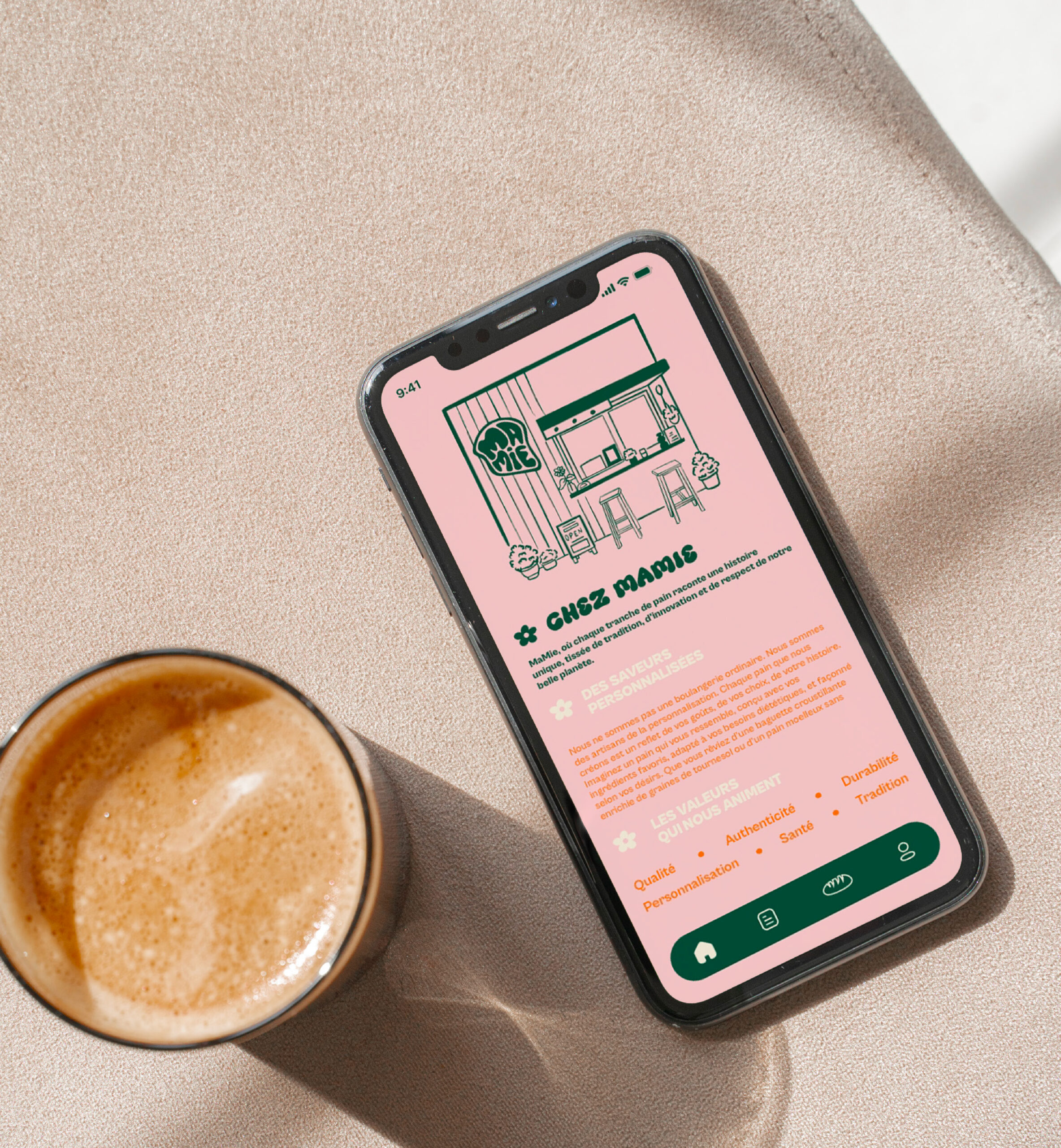 Cette vision s’est traduite dans un système de marque global, déployé à travers l’identité visuelle, l’univers d’espace, l’application mobile, les supports print et les réseaux sociaux. Au cœur du projet, une idée forte : faire dialoguer le savoir-faire boulanger avec des outils plus actuels, pour proposer une expérience plus intuitive et plus proche des usages contemporains. L’application mobile prolonge ainsi le concept en faisant de la personnalisation un véritable service, tandis que l’ensemble des supports construit une marque cohérente et immédiatement reconnaissable.