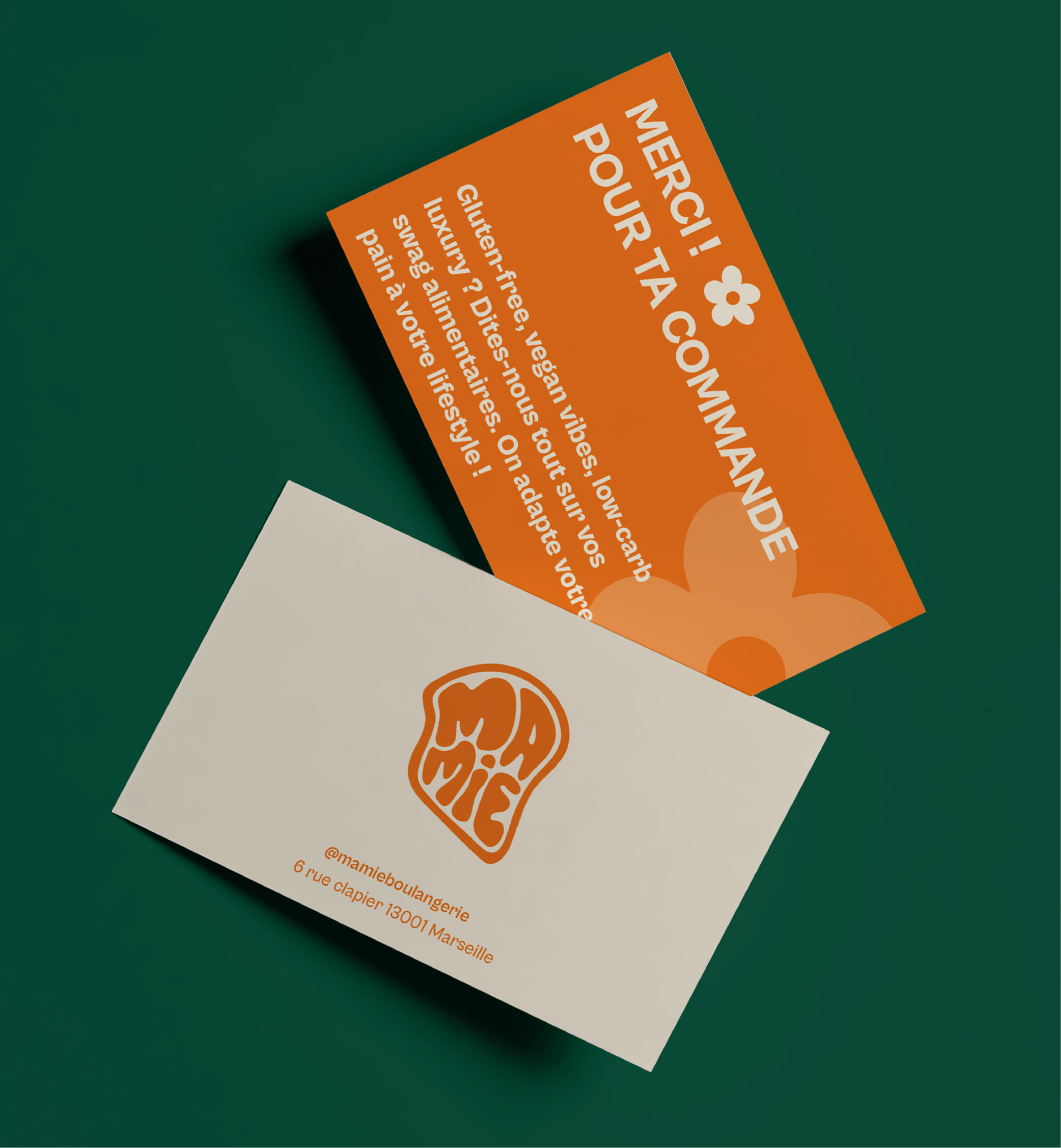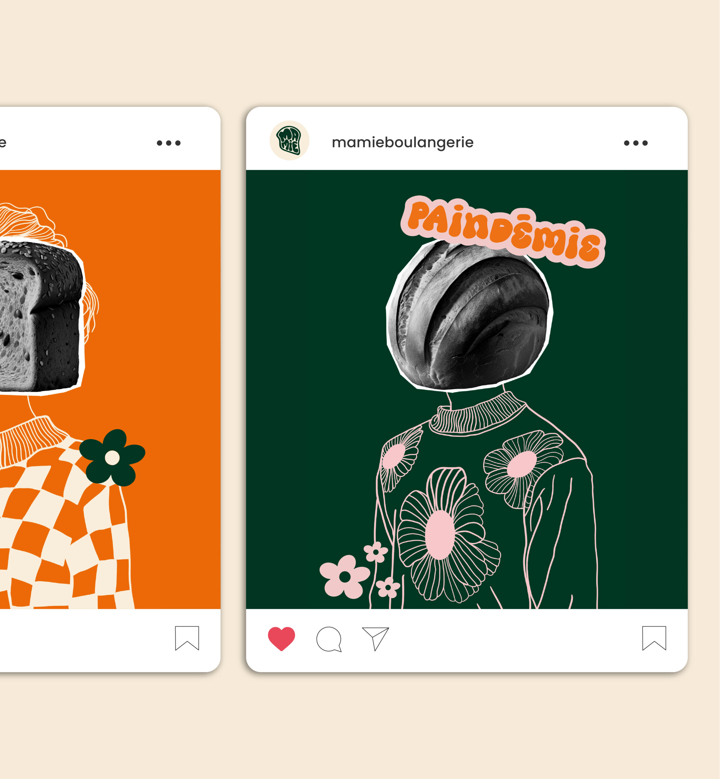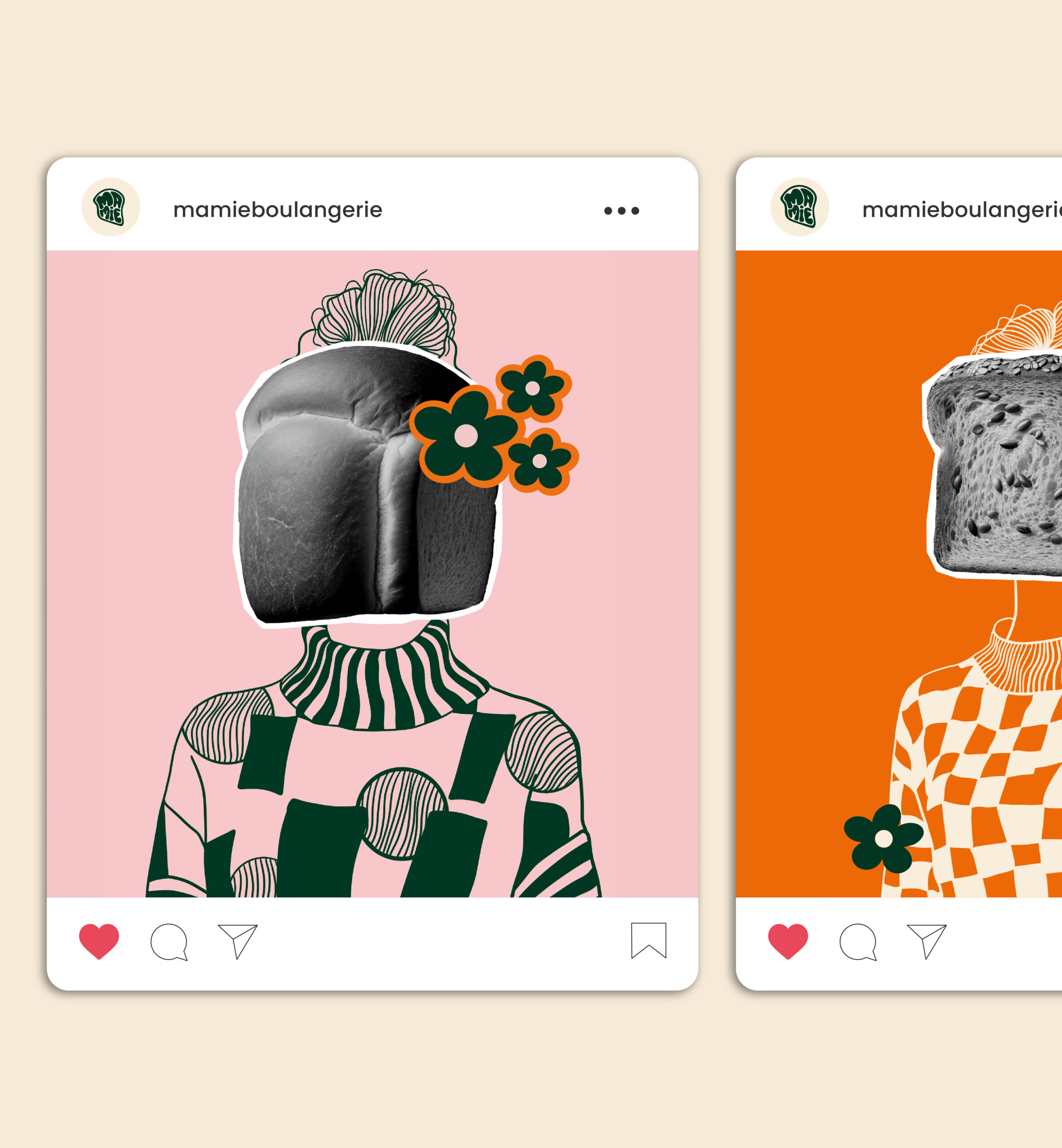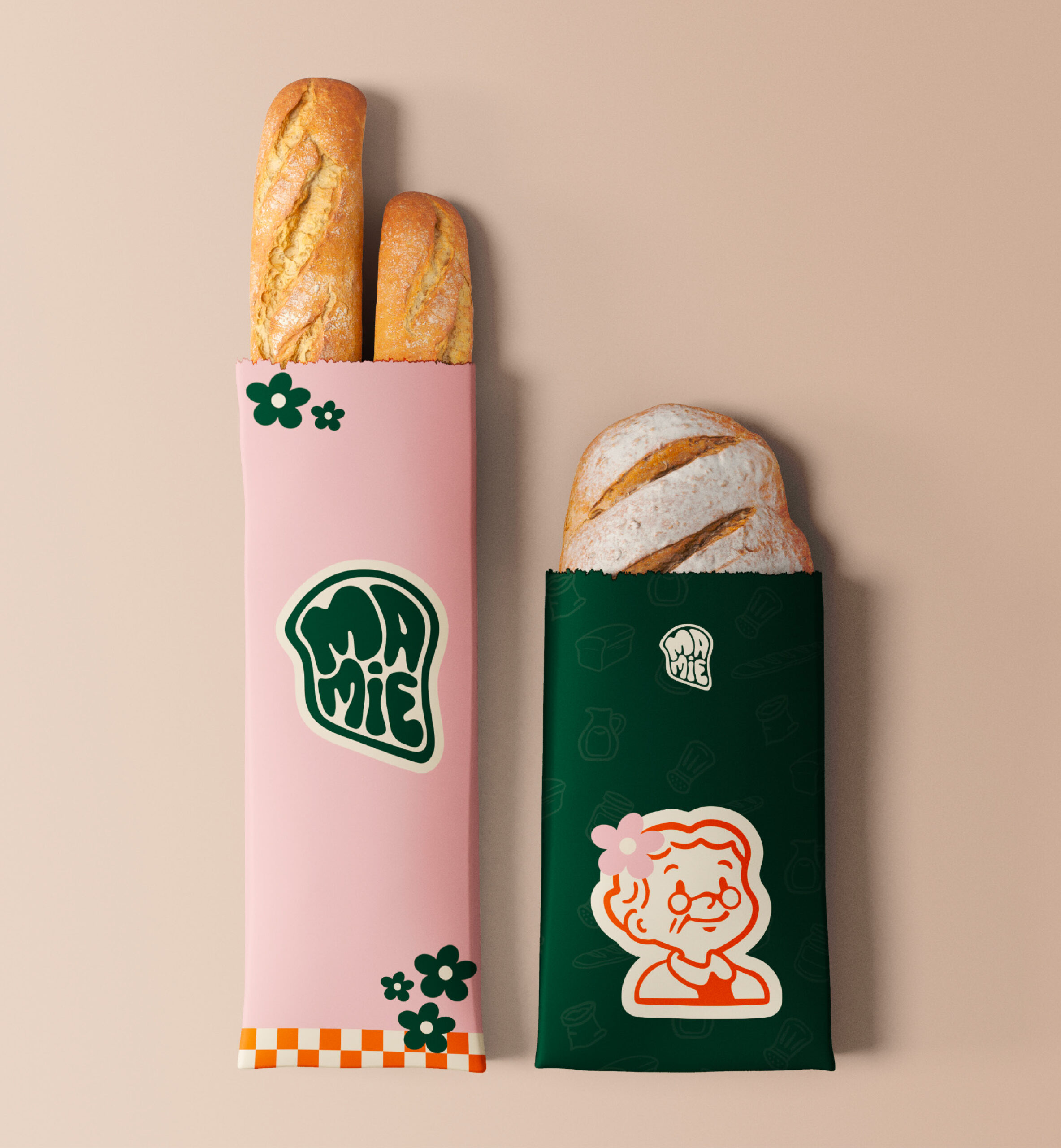 La marque s’est construite autour de cette idée de personnalisation, avec l’ambition de proposer une boulangerie capable de répondre à des besoins individuels, à des régimes spécifiques et à de nouvelles habitudes de consommation, sans renoncer à la dimension artisanale du produit. L’enjeu n’était donc pas seulement de créer une identité, mais de penser un univers complet. Le nom Mamie condense cette intention : une évocation affective et familière, associée à la mie de pain, qui installe d’emblée un territoire de marque chaleureux.